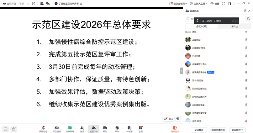 为提升全市慢性病防控专业能力,扎实推进慢病综合防控示范区建设,2026年3月6日市疾控中心慢病所组织召开了全市慢病防控能力建设线上培训班。来自全市26个国家级和7个市级示范区疾控中心的58名慢病防控业务骨干参加了培训。培训会由市疾控中心慢病所所长丁贤彬主持,首先介绍了此次培训的目的和要求,介绍了示范区信息管理系统的开发和填报的要求,随后详细介绍了重庆市示范区建设的进展情况,并就2026年示范区建设...