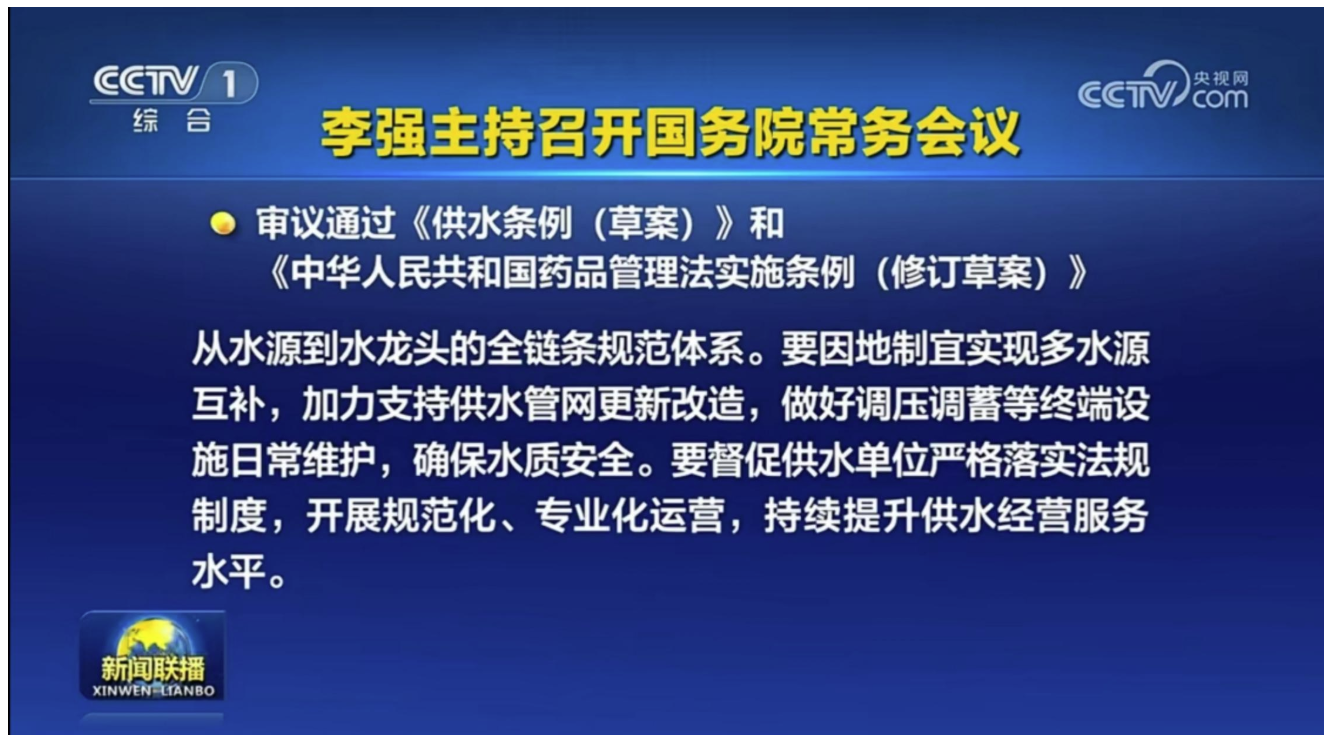 12月31日,国务院李强总理主持召开国务院常务会议,审议通过《供水条例(草案)》。会议指出,供水事业是民生事业,关系千家万户。要坚持城乡统筹,促进城市供水和农村供水共同发展,着力构建从水源到水龙头的全链条规范体系。要因地制宜实现多水源互补,加力支持供水管网更新改造,做好调压调蓄等终端设施日常维护,确保水质安全。要督促供水单位严格落实法规制度,开展规范化、专业化运营,加强供水安全风险管控,增强应急管...