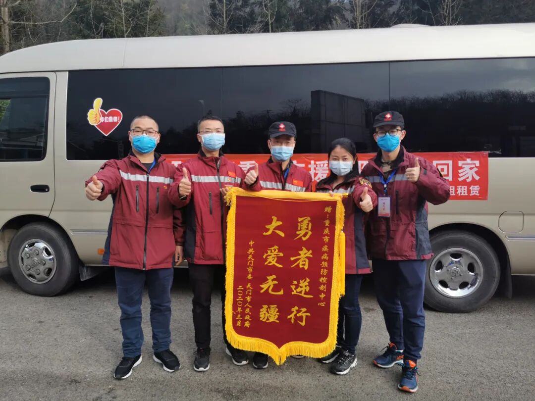 3月19日,天门市为撤离的重庆5名疾控专家举办欢送会,感谢他们为天门疫情防控工作所作出的努力。天门市委书记庄光明,市委副书记、代理市长杨兴铭,市委常委、统战部部长刘春霞出席活动。市委书记庄光明代表市委、市政府和170万天门人民,向专家组全体成员表示感谢,并向他们赠送写着“勇者逆行,大爱无疆”的锦旗。